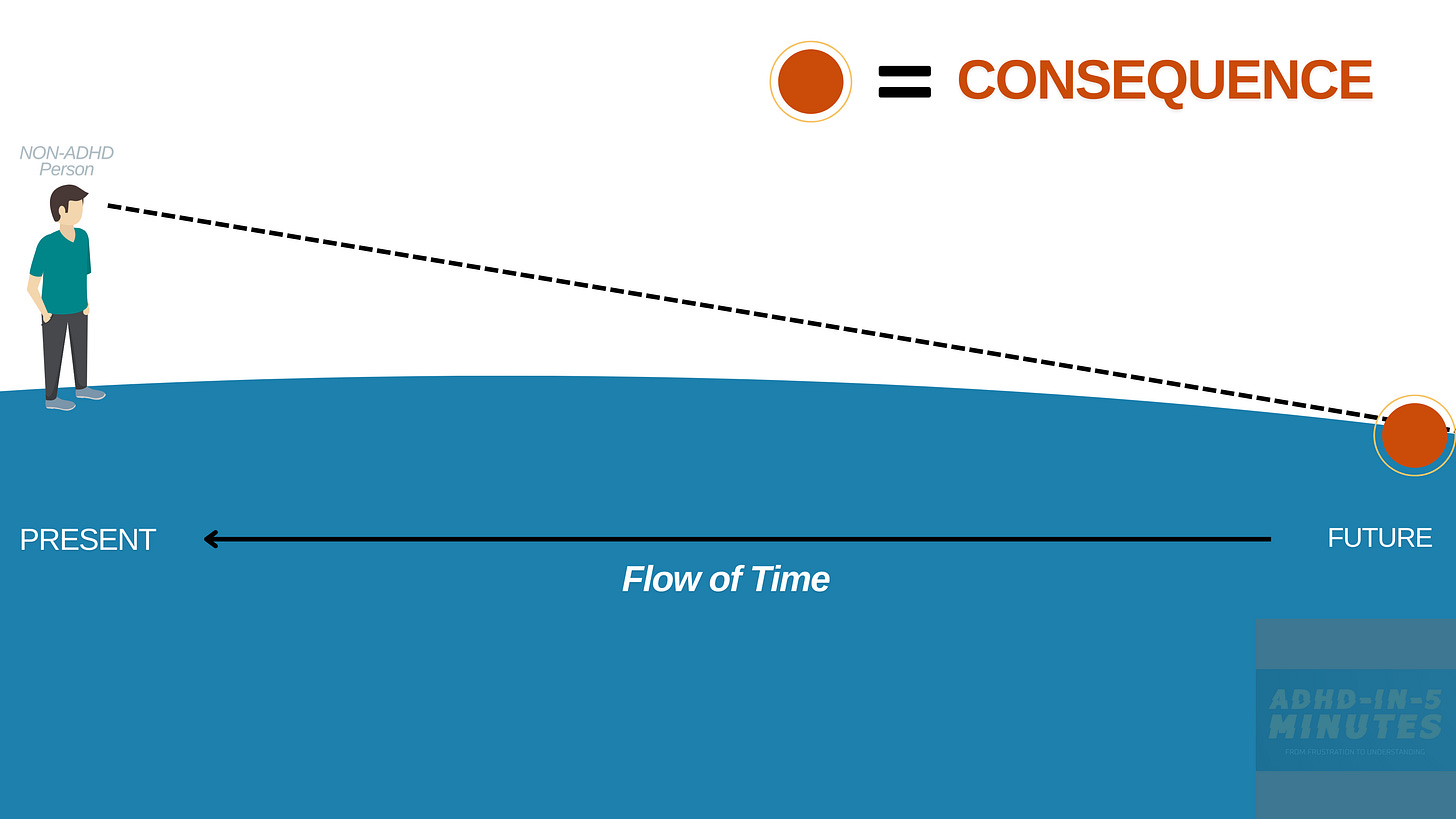 What I've found is that ADHDers aren't totally "blind" to time so much as they are nearsighted, which means we can see time in the here-and-now with perfect clarity, but cannot see (and thus respond to) consequences, events or goals that exist far into the future.