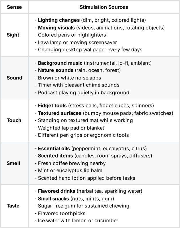 🔲 Set a new 5 minute timer, and layer 2-3 sources then do the task again. Notice if the task feels even more manageable or if you stayed focused longer.